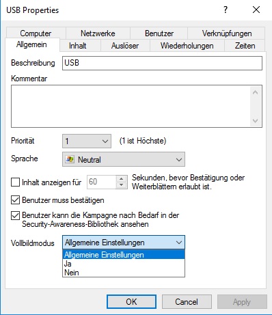Wählen Sie die Option Allgemeine Einstellungen, um die Vollbildmodus-Einstellungen in den allgemeinen Security-Awareness-Einstellungen für diese Kampagne zu übernehmen.