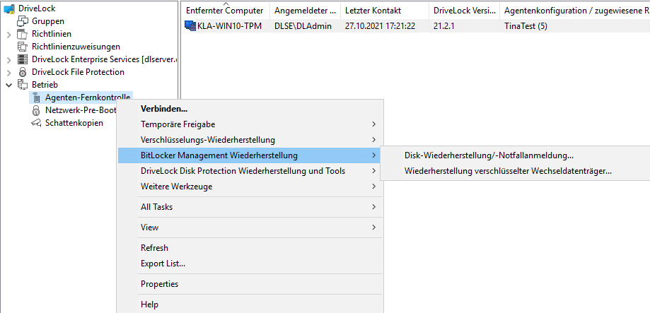 Für den Wiederherstellungsprozess in der DriveLock Management Konsole wählen Sie den Knoten Betrieb, öffnen dann das Kontextmenü der Agenten-Fernkontrolle und wählen dann den Menüpunkt BitLocker Wiederherstellung (s. Abbildung).