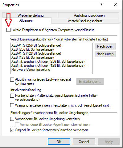 3. Entfernen Sie das Häkchen bei der Option Lokale Festplatten auf Agenten-Computern verschlüsseln.