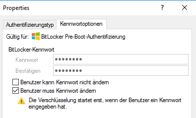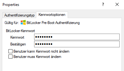 Das Vorgehen zum Entsperren von Datenpartitionen, die mit original BitLocker verschlüsselt wurden, und in DriveLock BitLocker Management übernommen werden sollen, richtet sich nach zwei Einstellungen in den Kennwortoptionen der BitLocker-Richtlinie: