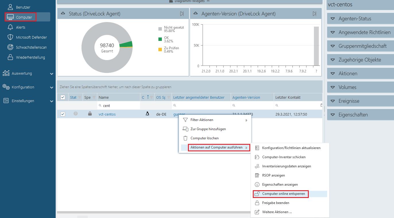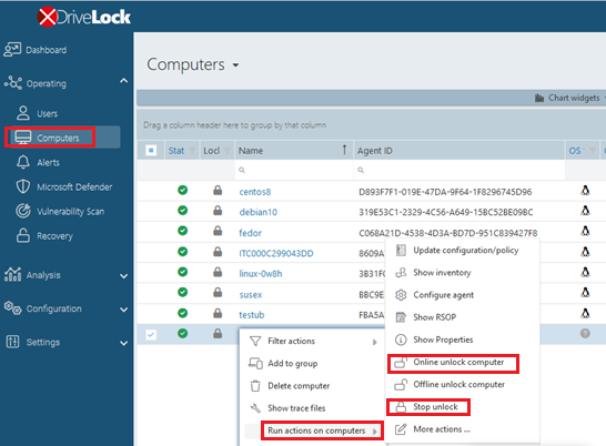 Es ist möglich, die Anwendungs- oder Laufwerkskontolle auf den Linux-Agenten vom DriveLock Operations Center (DOC) aus mit Hilfe der Aktion Computer online entsperren vorübergehend zu entsperren.