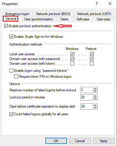 Enable logon using "password token": This method allows pre-boot authentication for a password token user. If you select this option, you have to select at least one Windows authentication method. If you check this option, then you need to select at least one more Windows authentication.