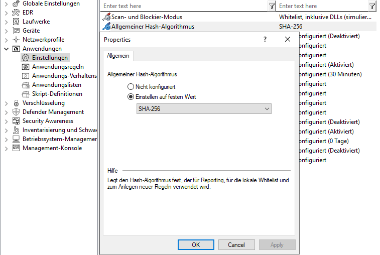 Mit dieser Einstellung geben Sie ein fest eingestelltes Hash-Verfahren an, der für Reporting, für die lokale Whitelist und zum Anlegen neuer Regeln verwendet wird.