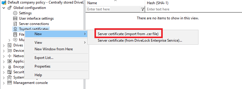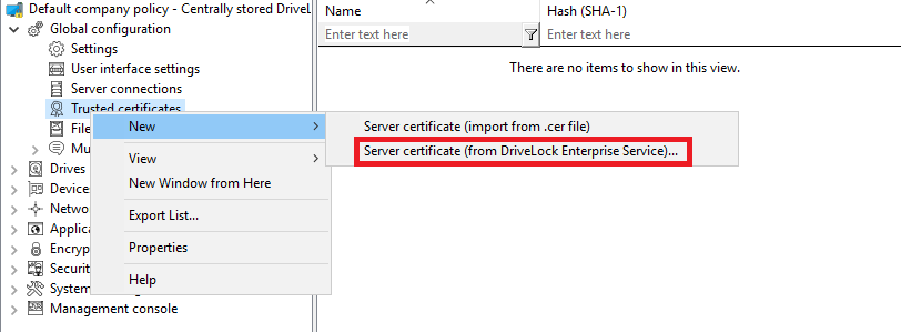 If you are using the server certificate that you selected during the DES installation with the Create self-signed certificate option, select New in the context menu and then Server certificate (from DriveLock Enterprise Service) .