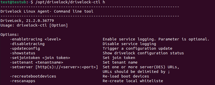 Mit diesem Kommandozeilentool können Sie die lokale Konfiguration eines Linux-Agenten ändern oder sich die aktuelle Konfiguration anzeigen lassen. Das Programm drivelock-ctl befindet sich im Installationsverzeichnis des DriveLock Linux-Agenten.