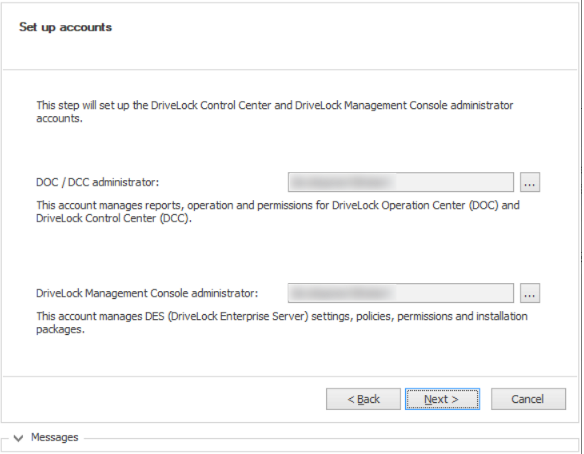DOC / DCC Administrator: this user or group will be allowed to access DriveLock Operations Center and DCC later (full access). Other permissions can be customized later.