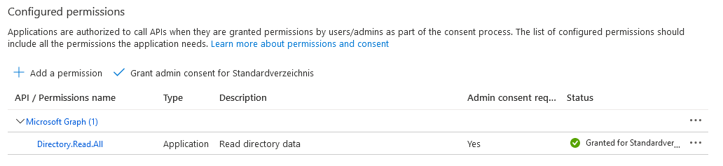In the "API permissions" section, assign the permissions as shown in the figure: