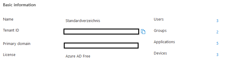 The following data from the Azure AD overview is required for synchronization. Make a note of the tenant ID and primary domain.