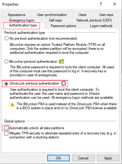 - The Automatically unlock all data partitions option has no effect on DriveLock pre-boot authentication because data drives are generally unlocked automatically.
