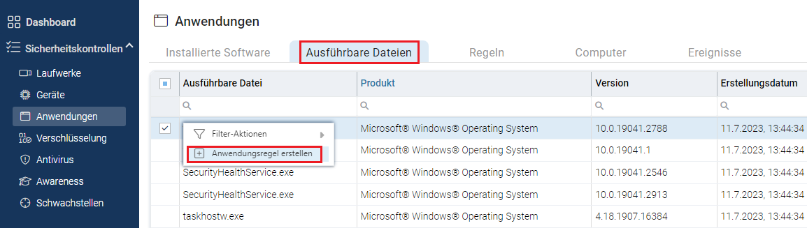 Wählen Sie die gewünschte(n) Dateie(n) aus, öffnen Sie das Kontextmenü und dann die Option Anwendungsregel erstellen. Der Regelerstellungsassistent öffnet sich und erstellt automatisch Regeln mit den passenden Eigenschaften.