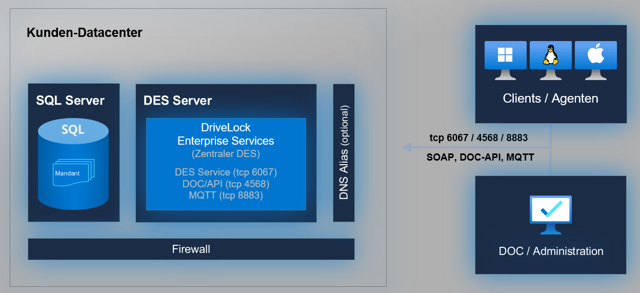 Der zentrale DriveLock Enterprise Service (DES) benötigt eine Datenbank, um die Konfiguration und Rückmeldungen der Agenten zu speichern.