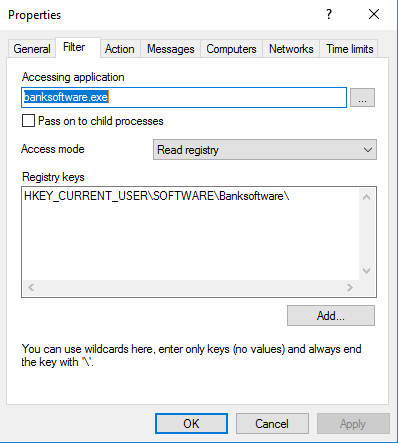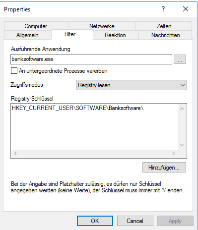 On the Filter tab, enter banksoftware.exe as Accessing application. As Access mode select Read registry and enter the key in the Registry key text box (in the example HKEY_CURRENT_USER\SOFTWARE\Bank Software\).