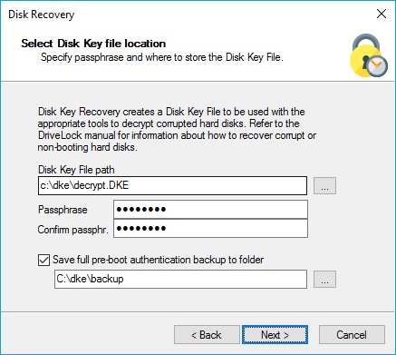 Select the Save full pre-boot authentication backup to folder checkbox and type the path for the location of the Backup.zip file that contains all recovery data stored in the DriveLock database for this computer.