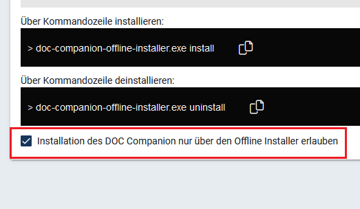 Der Start bzw. Download des DOC Companions durch einen Benutzer kann durch Auswählen der Option Installation des DOC Companion nur über den Offline Installer erlauben verhindert werden. Dies ist sinnvoll, wenn z.B. Helpdesk-Benutzer keinen Zugriff auf den Richtlinien-Editor erhalten sollen.