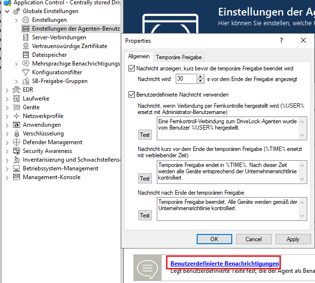 DriveLock zeigt Benutzer-Benachrichtigungen beim Endbenutzer an, um diesen über Änderungen, beispielsweise Sperrungen oder Freigaben von Geräten oder Laufwerken, zu informieren. Sie können von DriveLock vorgegebene Benachrichtigungen verwenden oder die Texte nach Ihren Vorgaben anpassen. An folgenden Stellen in der DMC können diese Benachrichtigungen angepasst werden: