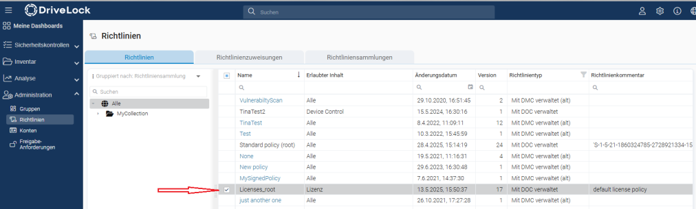 DriveLock legt im Vorfeld bereits automatisch eine Lizenz-Richtlinie für jeden Mandanten gesondert an. Diese Richtlinie vom Typ 'Mit DOC verwaltet' enthält Ihre erworbenen Lizenzen. Sie wird im DOC als 'default license policy' angezeigt und kann nicht bearbeitet werden. Die Version wird bei jeder Lizenzänderung automatisch geändert.
