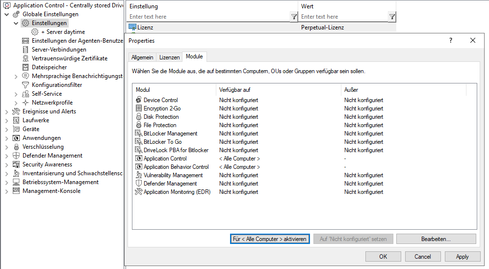 Sobald der DOC Companion Ihre Richtlinie (z.B. Application Control Richtlinie) geöffnet hat, befinden Sie sich im Richtlinien-Editor der DMC. Hier gehen Sie in den Globalen Einstellungen unter Einstellungen zu Lizenzen und öffnen den Reiter Module.