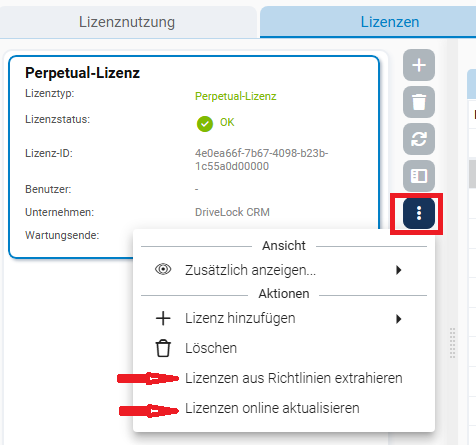 Des weiteren können Sie mit dem Menübefehl Lizenzen online aktualisieren manuell eine Lizenzaktualisierung anstoßen. Standardmäßig prüft der DES alle 12 Stunden auf Aktualisierungen. Nutzen Sie diesen Befehl, um nach Lizenzverlängerung die Lizenzen automatisch 'abzuholen', damit diese dann in Ihrer Lizenzrichtlinie aktualisiert werden kann.