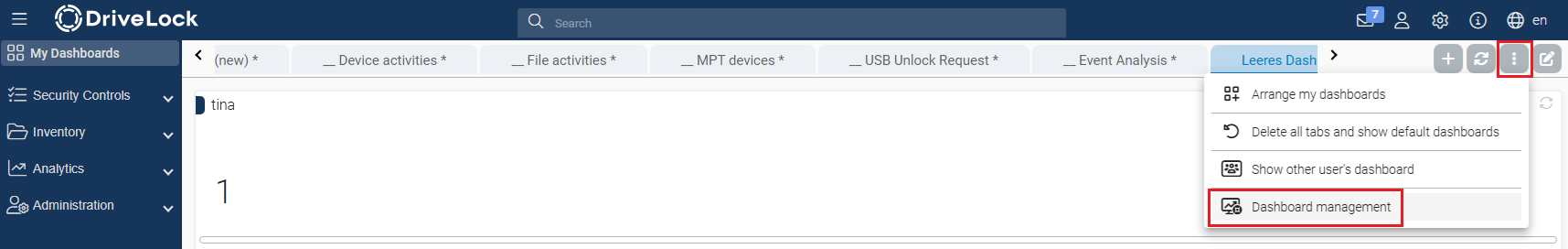 Users can adjust their dashboard tabs flexibly: Tabs can be easily added, removed and rearranged. All tabs - with the exception of custom dashboards - are references (links) and cannot be changed directly. All tabs - with the exception of custom dashboards - are references (links) and cannot be changed directly.