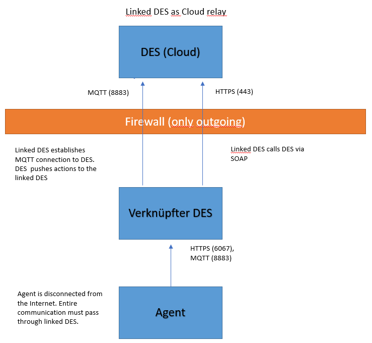 The linked DES in cloud mode acts as an intermediary to connect agents to the DriveLock Cloud when there is no internet connection.