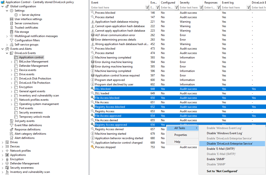 In the policy editor of the DriveLock Management Console (DMC), you can open the Events and Alerts node on the left-hand side and then select the DriveLock events sub-node. In this subnode, all events are grouped by the components that create them. When you select a node, a list of available events is displayed in the right part of the window.