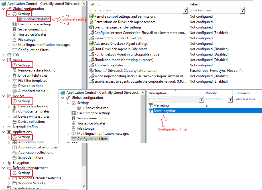 Configuration filters allow you to combine conditions (i.e. "conditional settings") for specific computers, users, or times into a single policy. The configuration filter itself has no functionality, but is used as a criterion for conditional settings. It can be used in all setting nodes of the DriveLock Management Console.