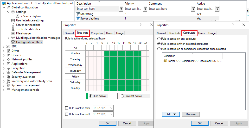 The rule with the conditional setting 'Automatic update' is thus disabled on the defined servers during the day, but active on all other DriveLock agents (as set in the normal settings).