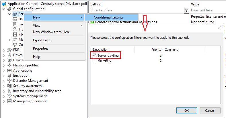 To do this, select the Settings sub-node under Global configuration, open the context menu and select New and as a Conditional setting your configuration filter Server daytime .