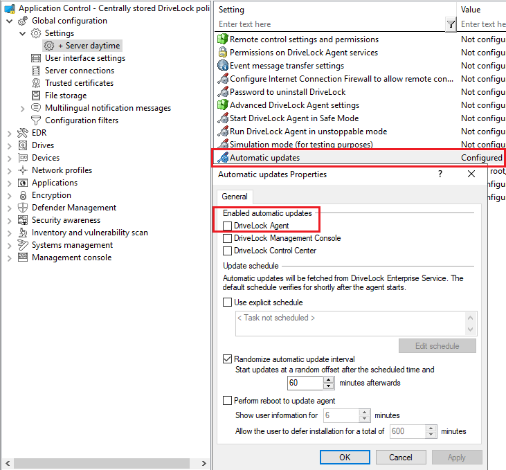 Goal: You want to disable automatic updating during the day for certain DriveLock agents (servers).