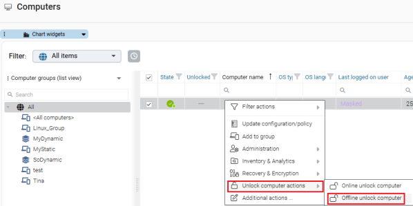 In the DriveLock Operations Center (DOC), use the menu command Offline unlock computer in the context menu of the respective computer under Unlock computer actions (see illustration).