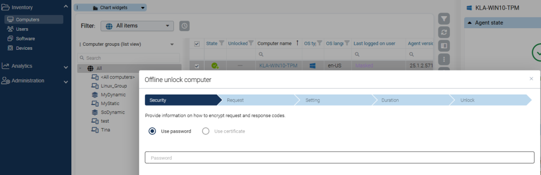 Depending on the offline unlock setting you specified in your policy, enter the password for offline unlock or select a certificate. You can import a certificate from a file or from the Windows certificate store on the local computer. To import a certificate from a file, click Import from file and select the certificate file. To import a certificate from the local certificate store, click Import from store.