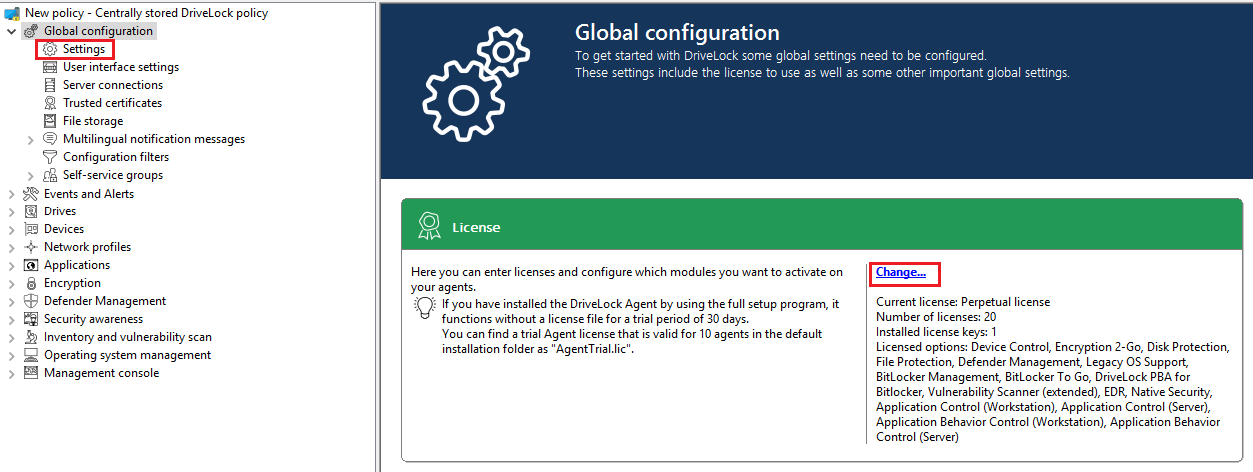 You can continue to enter your licenses in the same way as before version 2024.2 in the policy editor of the DriveLock Management Console (DMC) by navigating to Global configuration in the Settings subnode and then selecting License.