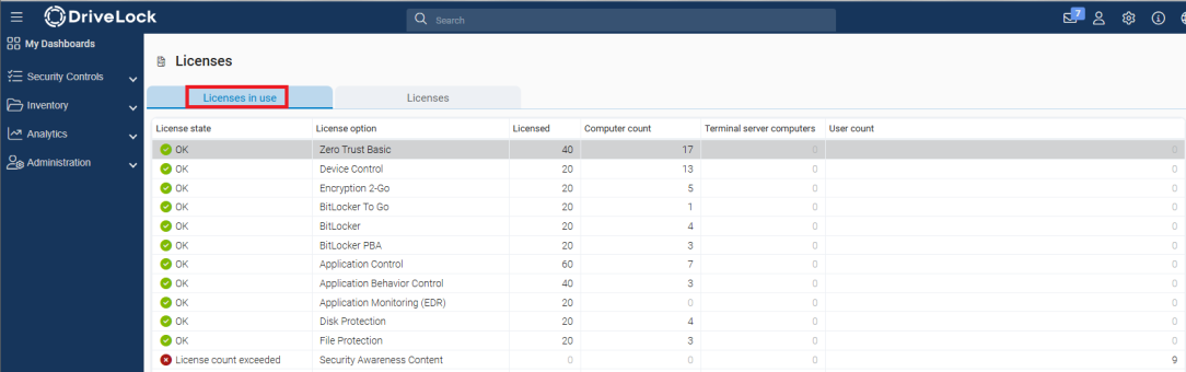 The User count column continues to display reported user sessions (local and via terminal servers). With the exception of the Security Awareness module, this number is also no longer included in the evaluation. For the Security Awareness module, the user count corresponds to the number of users who have participated in campaigns. This number continues to be used for determining the license status.
