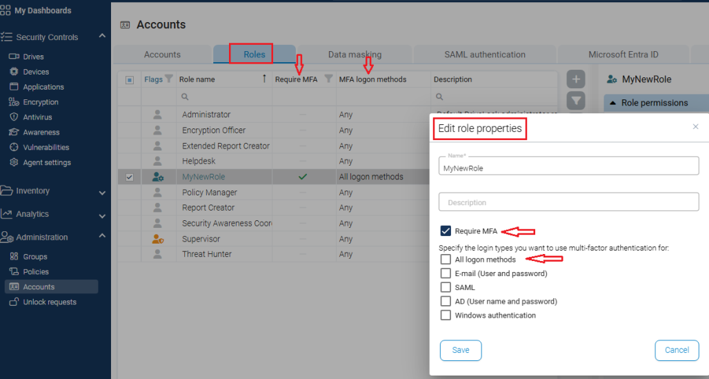Figure: The role view in the DOC shows where MFA is required and which login methods are available: