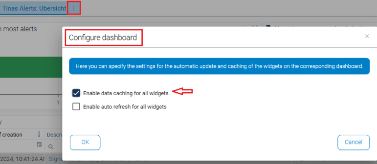 Caching logic: The widget data is determined the first time it is called up and temporarily stored in the tenant cache for a defined time (default: 300 seconds). When called up again within this period, the cached values are displayed.