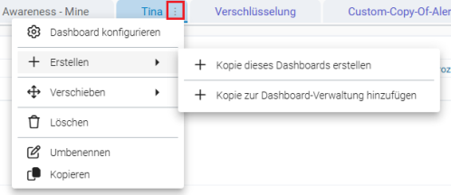 Unter Erstellen können Sie entweder eine eigene Kopie eines beliebigen Dashboards erstellen oder eine Kopie unter den benutzerdefinierten Dashboards in der Dashboard-Verwaltung anlegen.