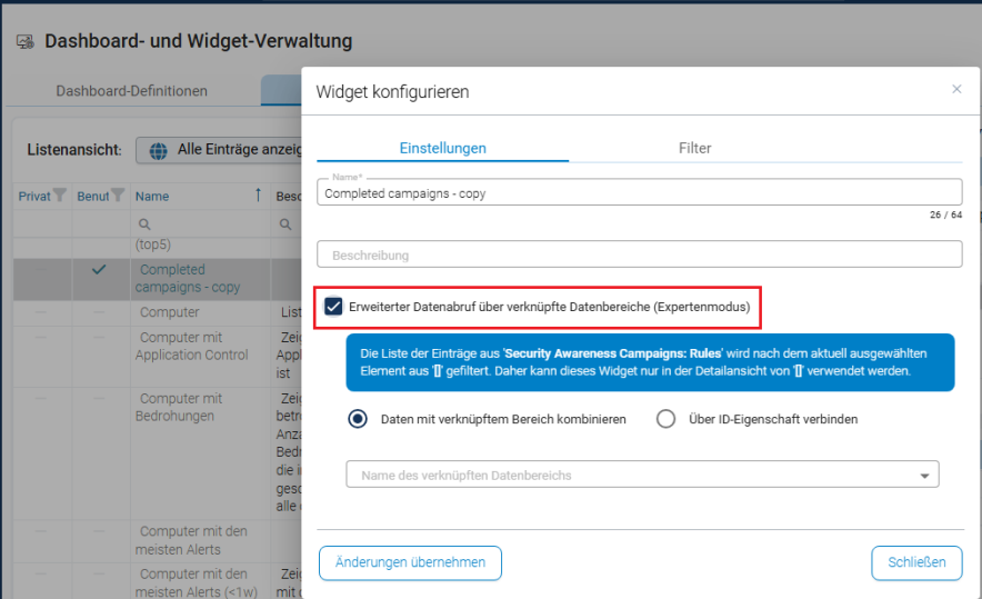Der Expertenmodus ermöglicht es, Daten aus verknüpften Schemas abzurufen. Der bestehende Filter wird dabei um das ausgewählte Objekt erweitert. Die Funktion ist für komplexe Widgets gedacht und sollte nur eingesetzt werden, wenn die Struktur der Schemas bekannt ist.