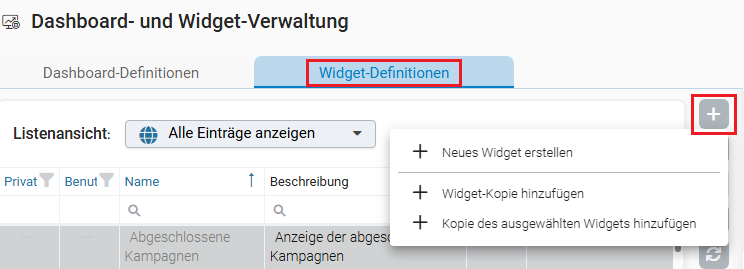 Ein neues Widget kann in den Widget-Definitionen über Neues Widget erstellen angelegt werden.
