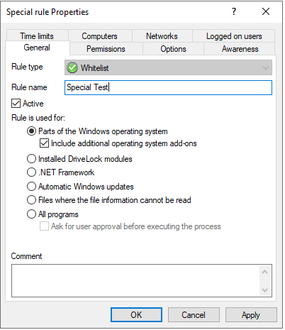You can use the special rules to easily identify all program files on a computer that meet a certain criterion, for example, to determine whether a file is part of the Microsoft operating system, or belongs to the installed DriveLock, or is a .NET program. You can also use the special rule to override a blacklist rule, for example, so that some users, such as the service administrators, can run all programs.