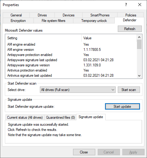 Click on Start update under Signature update to instruct Defender to renew the signature.