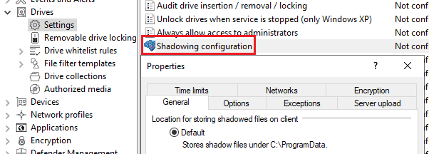 Upload shadowed files to central server: DriveLock offers the possibility to store shadow copies centrally. For this purpose, the path of a network share can be specified. DriveLock uses the user account, which also needs to be defined, to access the network share and store the shadow copies there. This process takes place at a configurable time interval (default 15 min).