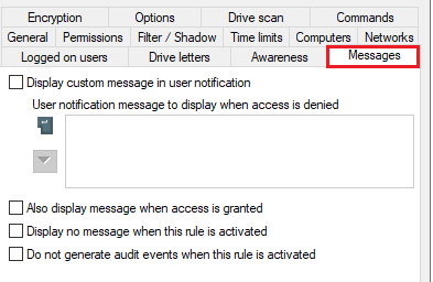 On this tab you can configure user notifications. You can configure a separate user message for each rule. Unless otherwise set, this message is shown to users when access to a drive is denied.