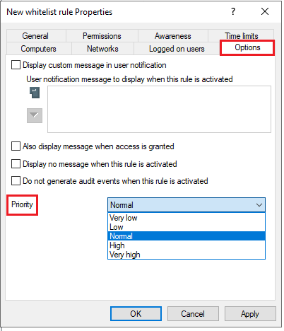 For each rule you can configure a separate user message on the Options tab. Unless otherwise set, this message is shown to users when access to a device is denied.