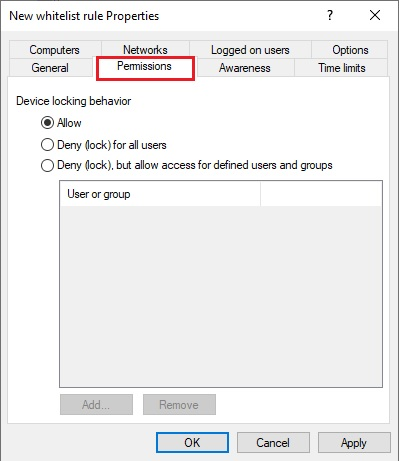 In the DriveLock Management Console (DMC), open the Permissions tab to define the users or groups that have permission to access a drive, device or application.