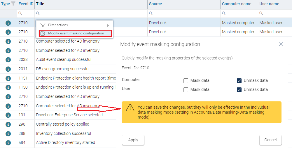 Example: All the user data is masked, but the computer data is not. An administrator wants to identify the user when a specific event occurs, so here it would be useful to show the data temporarily. In this case, the Mask or unmask data temporarily option can be used. At the same time, a temporary masking of the computer data can be requested.