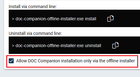 It is possible to prevent users from starting or downloading the DOC Companion by selecting the option Allow installation of the DOC Companion only via the offline installer. This is useful if, for example, helpdesk users are not supposed to have access to the Policy Editor.