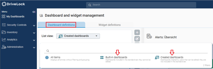 Dashboard definitions determine which dashboards are available in the system. This includes both built-in system dashboards and user-created dashboards that can be customized individually. A dashboard consists of one or more tabs, each containing widgets.