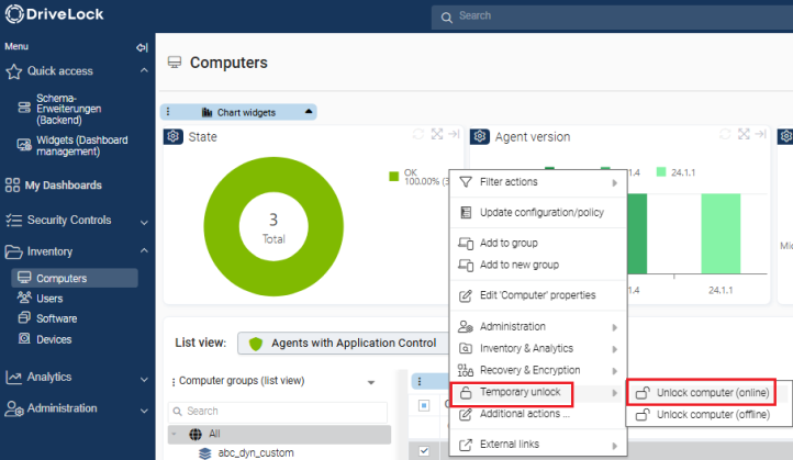 In the DriveLock Operations Center (DOC), use the menu command Unlock computer (online) in the context menu of the respective computer under Temporary unlock (see illustration).