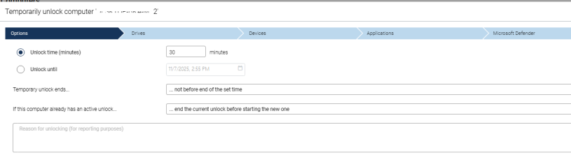 Using temporary unlocking, you can quickly and temporarily allow a connected DriveLock Agent to access locked drives, devices or applications and/or disable Microsoft Defender control.