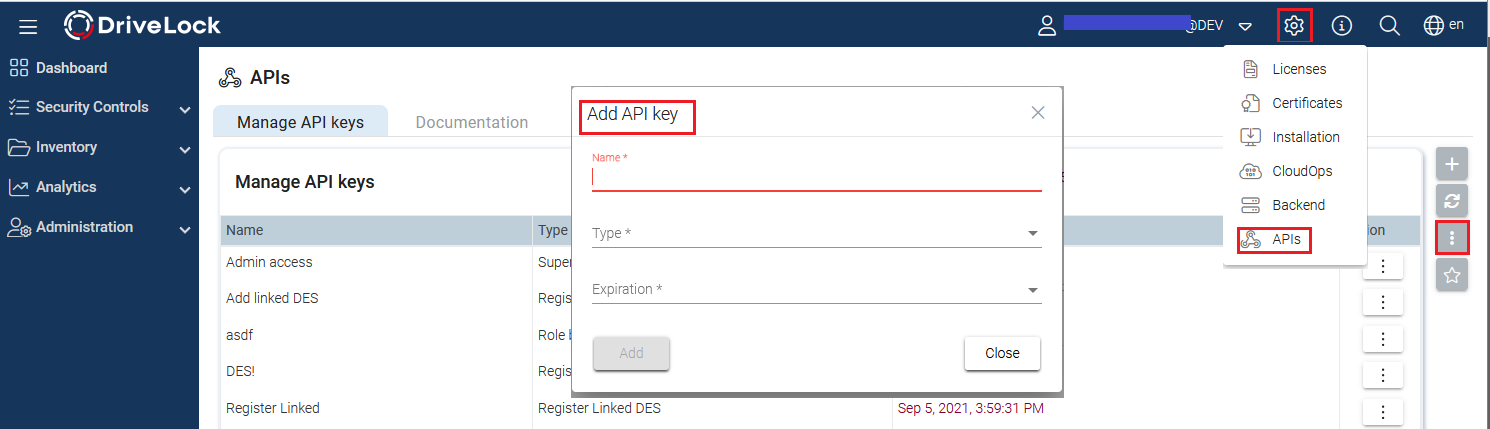 To do this, open the APIs view in the DOC via the settings (cog icon) and the APIs menu command. You can add an API key via the selection menu, see the figure below: